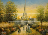 This piece is a grand landscape piece, with the Eiffel Tower towering over the trees and the boulevard. Done with oil on canvas.