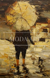 Walking Dog in Rain is an impressionist piece of a man walking his dog, on a leash, while carrying an umbrella. This piece is a dreamy, solemn artwork that will bring back memories of man's best friend.