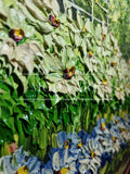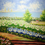 Begonia Garden (Green) is a scenic landscape of flowers lining a garden in front of a small cottage home. Soothing and peaceful to look at, this piece is ideal for a family home.