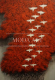 Flight Path Red is a contemporary political statement piece depicting a flight of migratory birds over a red forest, escaping the ravages of climate change.
